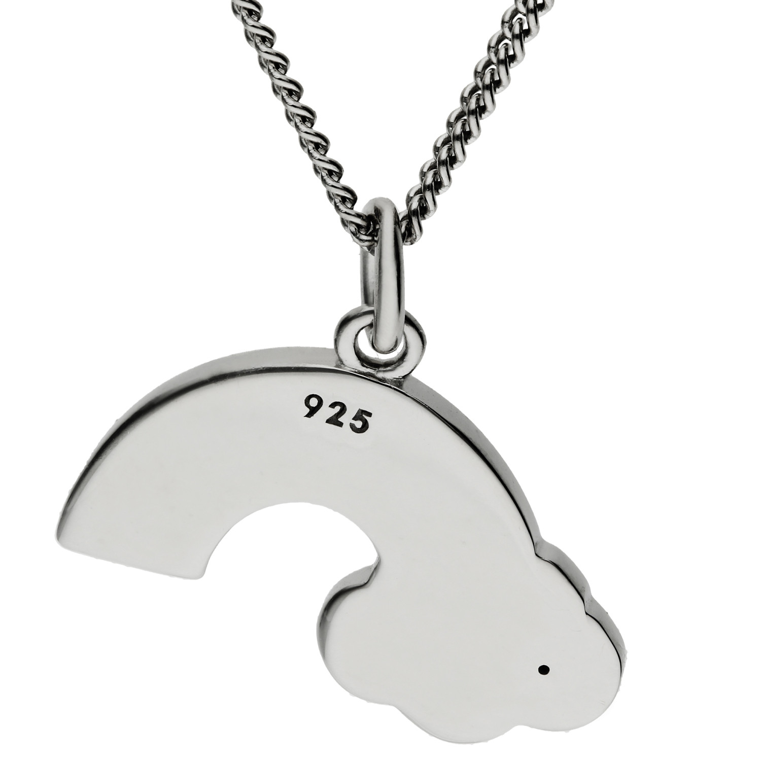 Brighten up their jewellery collection with this adorable Children’s Sterling Silver Necklace, featuring a delightful rainbow and cloud design. The pendant showcases vibrant resin enamel detailing in shades of pink, purple, and green on the rainbow, while the cloud is adorned with a tiny sparkling accent diamond for an extra touch of charm.