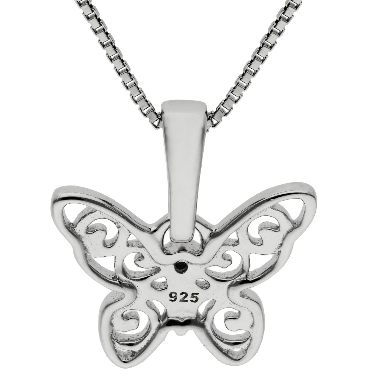 Bring a touch of whimsy to your child's jewellery collection with this charming Children's Sterling Silver Filigree Butterfly Pendant. Featuring an intricately detailed filigree butterfly design, this pendant showcases a timeless elegance. A tiny diamond accent adds a delightful sparkle, making it a truly special piece.
