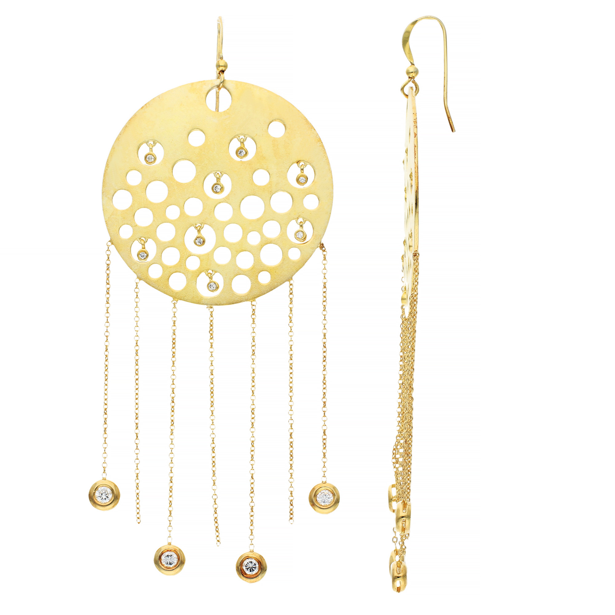 These fabulous earrings are each created with a striking and gorgeous sterling silver disk embellished in yellow gold plating and fringed with chain and sparkling cubic zirconia.