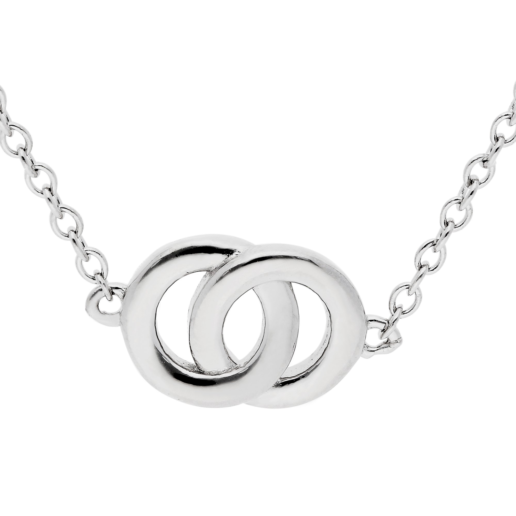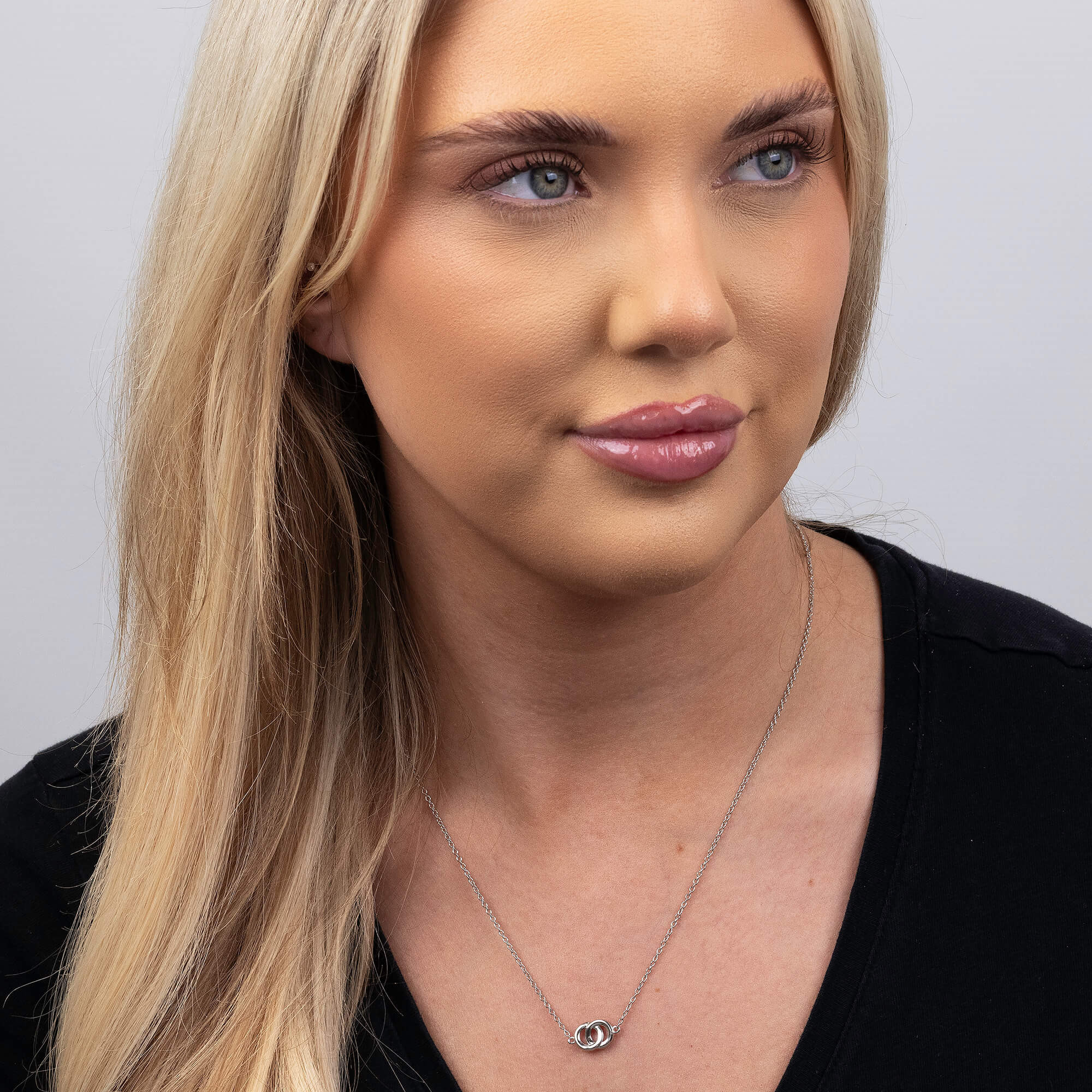 Elevate your style with this elegant Sterling Silver Necklace, designed with two interlocking circles that exude simplicity and modern charm. The polished sterling silver circles are seamlessly integrated into an 18-inch chain, creating a refined and effortless accessory.