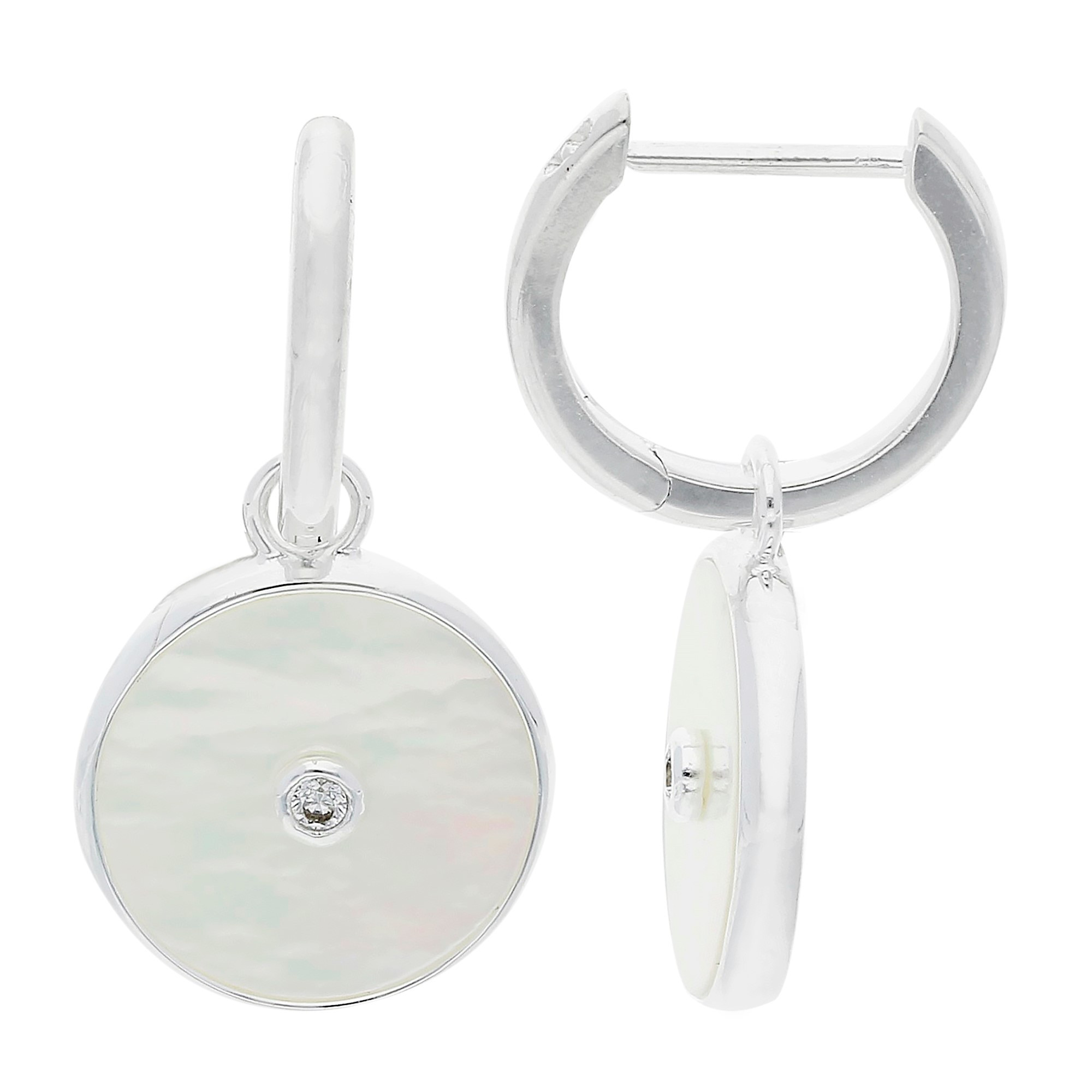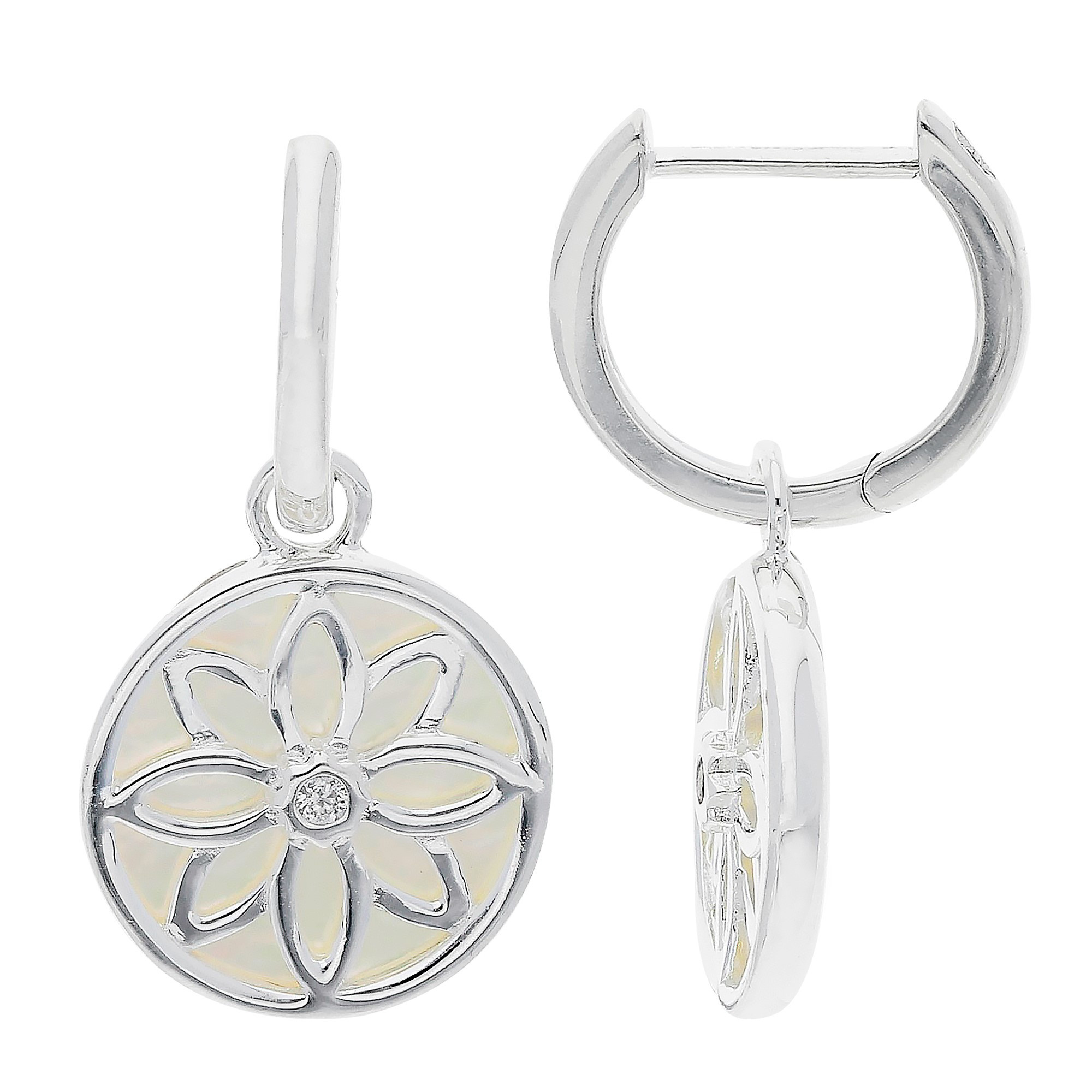 Delight in the dual-sided design of our Women's Mother of Pearl Sterling Silver Drop Earrings, perfect for adding a unique twist to your accessory collection. Each earring features a disc of shimmering mother of pearl, held within a beautifully detailed silver setting that showcases a flower design on one side and the sleek, pearly surface on the other. Central cubic zirconia stones on both sides ensure that whichever style you choose, your look will sparkle. The earrings are designed with silver hinged hoops for secure and comfortable wear. Ideal for those who love their jewellery to be as flexible as their lifestyle, these reversible drop earrings offer two distinct styles in one, providing effortless elegance for every day or special occasions.