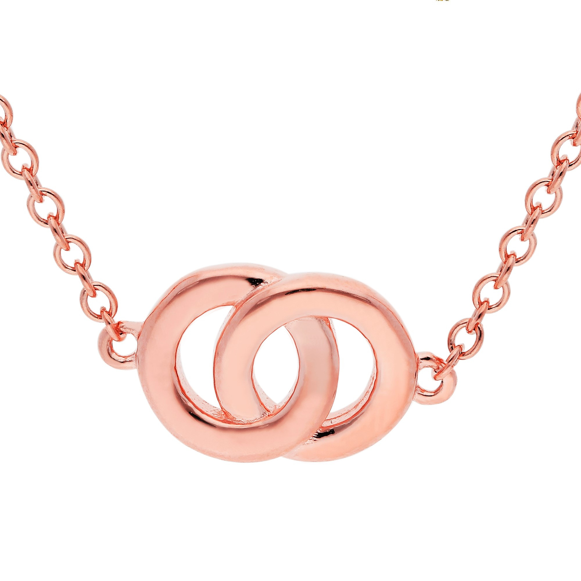 Celebrate modern elegance with this Rose Gold Plated Sterling Silver Necklace, designed to make a subtle yet stylish statement. The necklace features two interlocking circles crafted from sterling silver and coated in a radiant rose gold plating for a touch of warmth and sophistication.